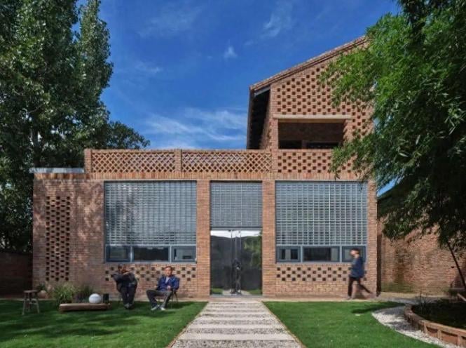 Để tiết kiệm chi phí, ban đầu nhóm không tráng xi bên ngoài tường gạch. Tuy nhiên, điều này khiến ngôi nhà mất đi tính thẩm mỹ. Sau nhiều lần bàn bạc, Vương Di Quỳnh nảy ra ý tưởng lắp xen kẽ những tấm kính trong suốt vào mảng tường thô. Thiết kế vừa giúp không gian sáng sủa hơn, vừa tạo điểm nhấn hiện đại cho công trình.