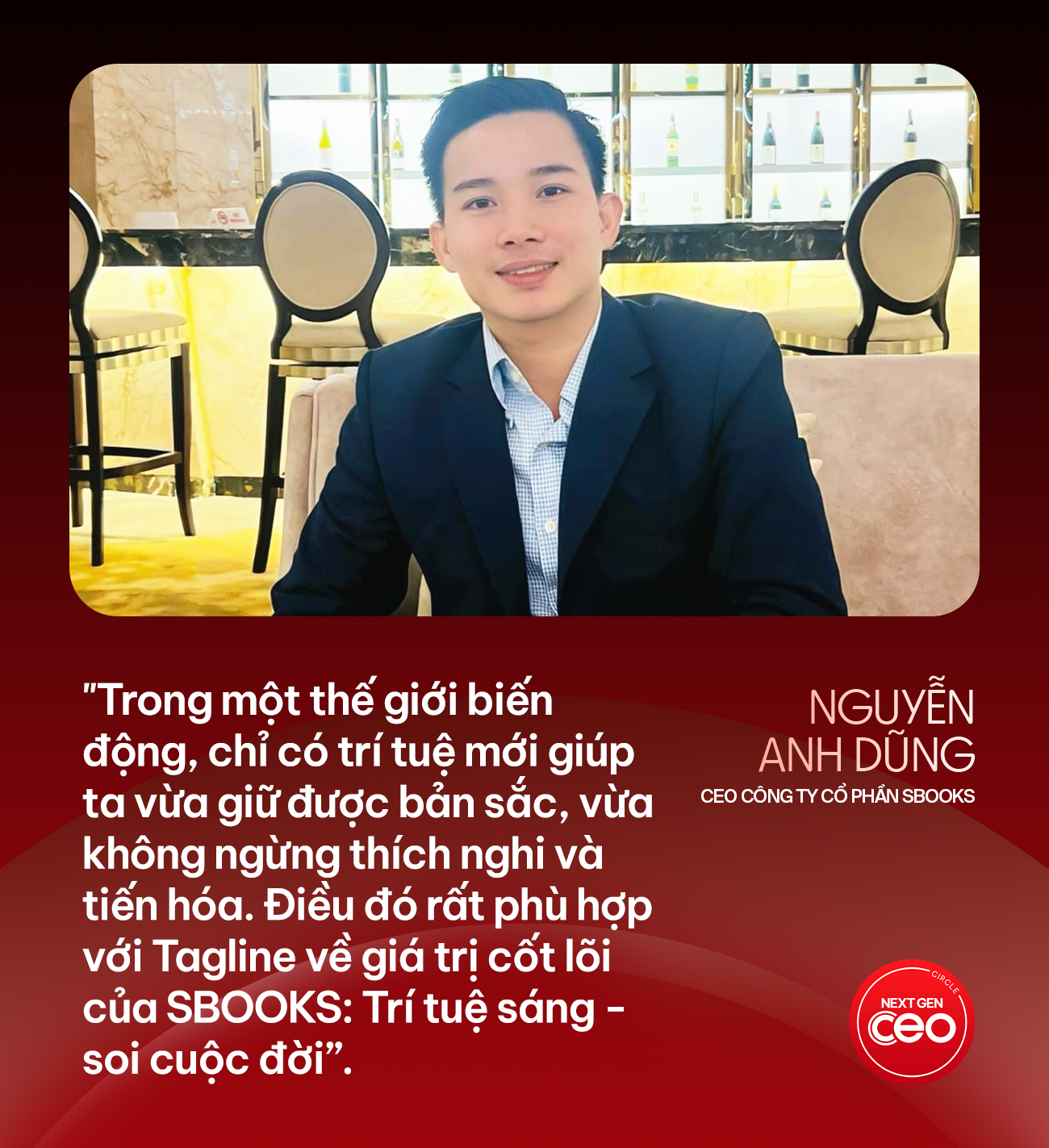 Trong một thế giới biến động, chỉ có trí tuệ mới giúp ta vừa giữ được bản sắc, vừa không ngừng thích nghi và tiến hóa và điều đó rất phù hợp với Tagline về giá trị cốt lõi của SBOOKS “Trí tuệ sáng - soi cuộc đời”. Tôi tin rằng, một doanh nghiệp sống trí tuệ sẽ luôn biết cách đứng vững, phát triển bền vững, và lan tỏa giá trị tốt đẹp cho xã hội”, CEO Nguyễn Anh Dũng khẳng định.