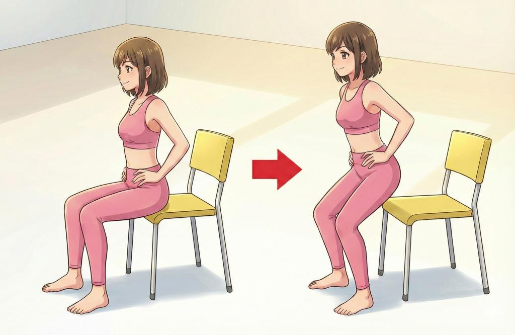Việc nhấc nhẹ mông khỏi ghế rồi ngồi xuống lại nhiều lần giúp kích hoạt nhóm cơ lớn ở thân dưới, hỗ trợ khả năng đi lại mà không gây quá tải. Cách thức hiện: Đứng thẳng, hai chân rộng bằng vai, nhấc nhẹ mông khỏi ghế rồi ngồi xuống. Lặp lại 10 lần.